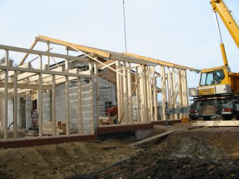 eingegliedertem Bürotrakt erstellt. Alle Gebäudeteile werden überwiegend in Holzrahmenbauweise erstellt. |