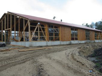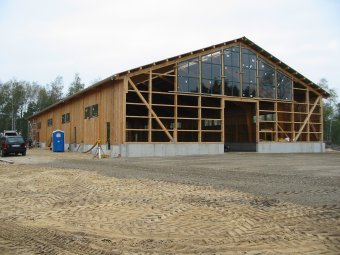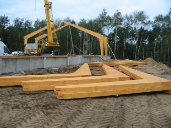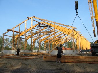 Die tragende Konstruktion wird aus Brettschichtholz-Dreigelenkrahmenbinder hergestellt. |